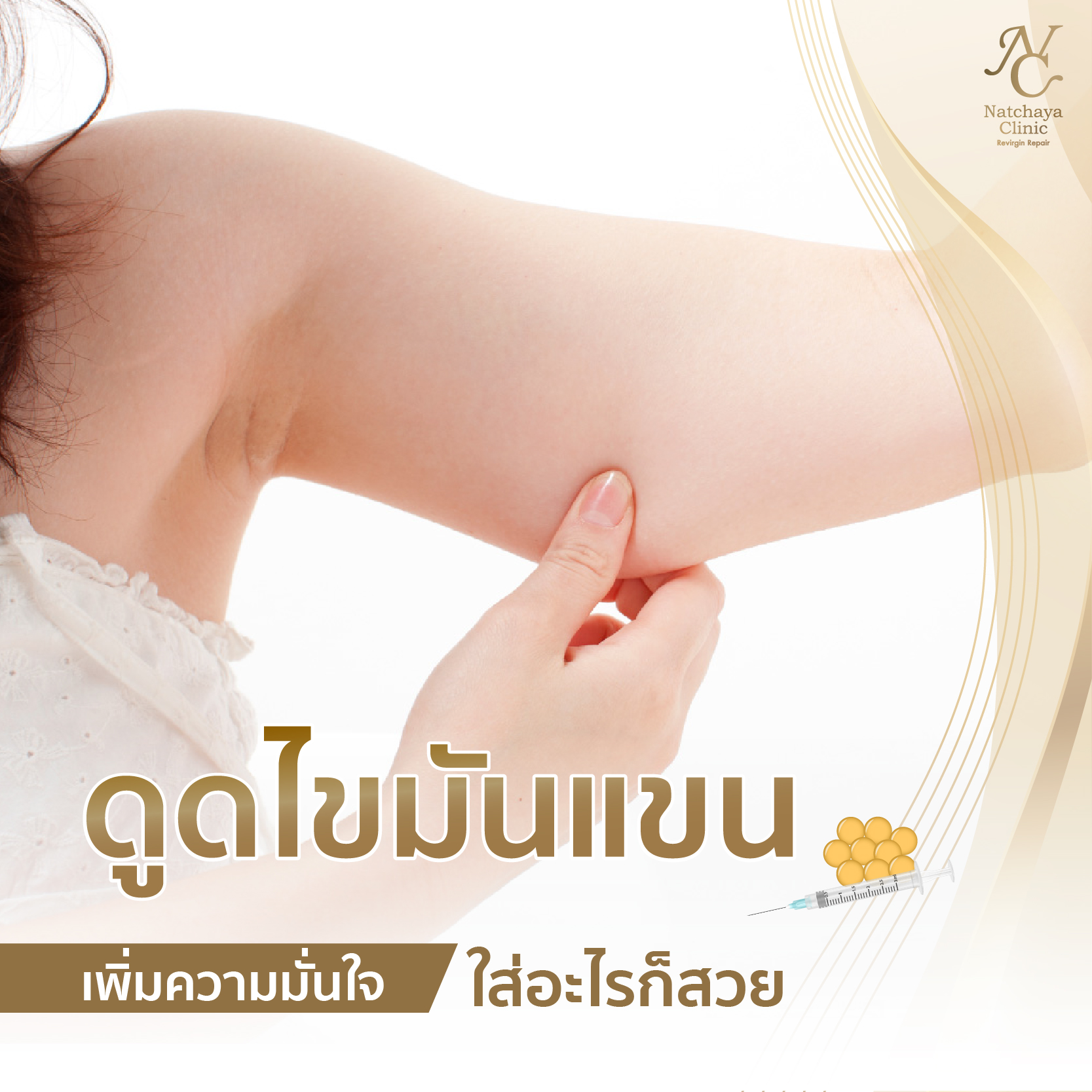 สำหรับสาว ๆ ที่รักในการแต่งตัว และอยากจะเดินออกจากบ้านไปด้วยความสง่าผ่าเผยและความมั่นใจในตัวเองเต็มร้อย แต่สิ่งที่มักจะเป็นตัวทลายความมั่นใจให้กับคุณผู้หญิงอย่างรุนแรงเสมอมา เห็นทีจะหนีไม่พ้น บรรดา “ไขมันส่วนเกิน” ที่ขึ้นมาพอกตามร่างกายของเรา ๆ นี่เอง ไม่ว่าจะเป็น ต้นขา หน้าท้อง หรือแก้ม โดยเฉพาะอย่างยิ่งกับ “ต้นแขน” ที่เป็นหนึ่งในจุดทลายความมั่นใจที่เด่นที่สุดแล้ว