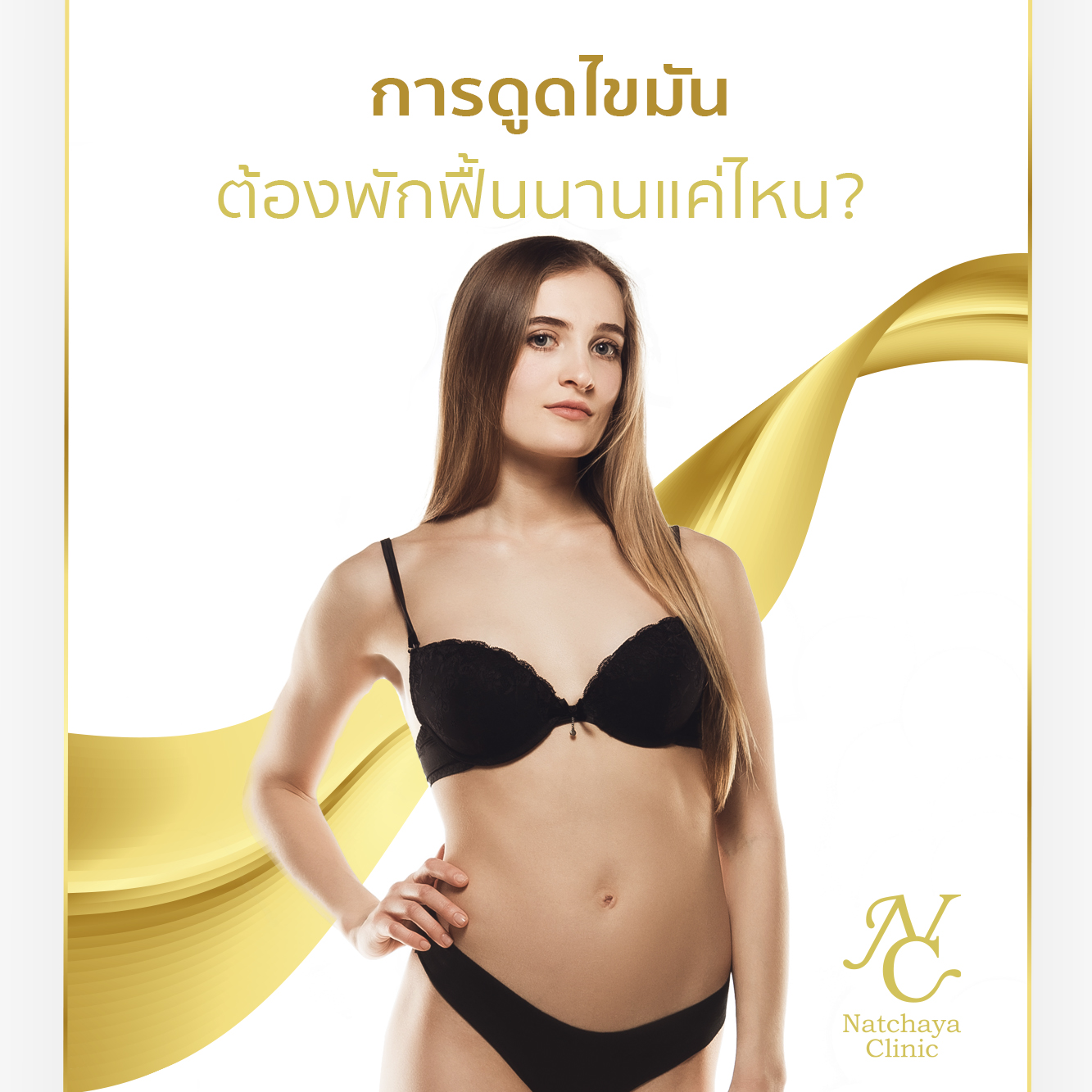 ซึ่งในขั้นตอนการพักฟื้นนั้น หลายคนสงสัยว่า หลังจากที่เราเข้ารับการดูดไขมันแล้ว จะต้องใช้ระยะเวลาในการพักฟื้นนานแค่ไหน และต้องระมัดระวังในเรื่องใดบ้าง วันนี้เราจะมาให้ความรู้เกี่ยวกับการพักฟื้นหลังจากการดูดไขมันว่าต้องใช้เวลานานแค่ไหน เพราะหลังจากการดูดไขมัน ก็จะมีผลข้างเคียงบ้างเล็กน้อยถือว่าเป็นเรื่องปกติ โดยหลังดูดไขมันใน1-2วันแรก จะมีน้ำซึมจากแผลค่อนข้างมาก ซึ่งจะไหลซึมออกมาเรื่อย ๆ เราจะต้องคอยซับตลอดเวลา บางคนจะเกิดแผลมีลักษณะเหมือนปากกาจุด ซึ่งมีขนาดเล็กมากไม่จำเป็นต้องเย็บ แต่ต้องรักษาความสะอาดทำแผลสม่ำเสมอ และแผลห้ามโดนน้ำ 7 วัน เพื่อป้องกันการติดเชื้อ สิ่งที่สำคัญคือการใส่ชุดยกกระชับ ในช่วง 1 เดือนแรกควรสวมชุดกระชับตลอด 24 ชั่วโมง แต่ให้ถอดได้เฉพาะเวลาอาบน้ำ หรือวันละ 1-2 ชม. ในเดือนที่ 2-3 ให้ใส่วันละ 12 ชั่วโมง เพื่อให้ผิวหนังมีความกระชับ เพราะการสวมชุดกระชับ เป็นสิ่งที่สำคัญที่สุดในการดูแลตัวเองหลังดูดไขมัน นอกจากจะทำให้ผิวหนังแนบสนิทติดกับกล้ามเนื้อแล้ว ยังช่วยให้อาการช้ำเขียวของคนไข้ลดน้อยลงด้วย เพราะการสวมชุดกระชับ จะทำให้เกิดการกดทับในบริเวณที่เลือดออก ช่วยทำให้เลือดหยุดไหล จึงช่วยลดเขียวได้ดี สำหรับใครที่สวมใส่ชุดกระชับตามคำแนะนำของแพทย์อย่างเคร่งครัด เมื่อถอดออกจะเห็นว่ารอยช้ำเขียว เปลี่ยนเป็นสีเหลืองอย่างรวดเร็ว และจางหายไป นอกจากนี้ อาจจะจะมีอาการปวดล้า กล้ามเนื้อต้นขาได้บ้างเล็กน้อย แต่สามารถเดินได้ตามปกติ สามารถทำกิจวัตรประจำวันได้ทันที