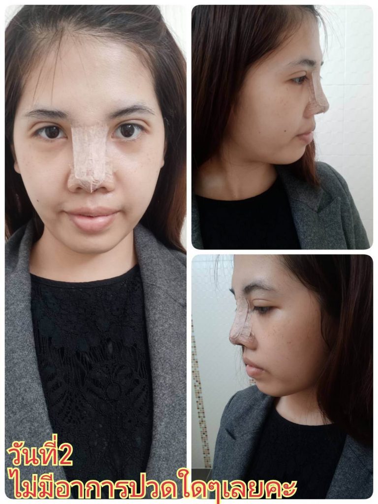 พอถึงเวลาคุณหมอมาอันดับแรกคือคุณหมอเหลาซิลิโคนให้เข้ากับจมูก ใช้เวลาในการเหลานานพอสมควร พอได้ซิลิโคนแล้ว คุณหมอก็เริ่มฉีดยาชาที่บริเวณหูค่ะ เพื่อผ่าตัดเอากระดูกอ่อนหลังใบหูมารองปลายจมูก และคุณหมอก็ทำการเย็บแผลบริเวณหลังหู จากนั้นคุณหมอจะเริ่มค่อยๆ ฉีดยาชาไล่ค่ะ ความรู้สึกตอนฉีดยาชา เจ็บนิดๆ ค่ะ เจ็บแบบเราทนได้ หลังจากนั้นไม่เจ็บแล้วค่ะ นอนชิวๆ ใช้เวลาในการทำชั่วโมงหน่อยๆ โดยประมาณ